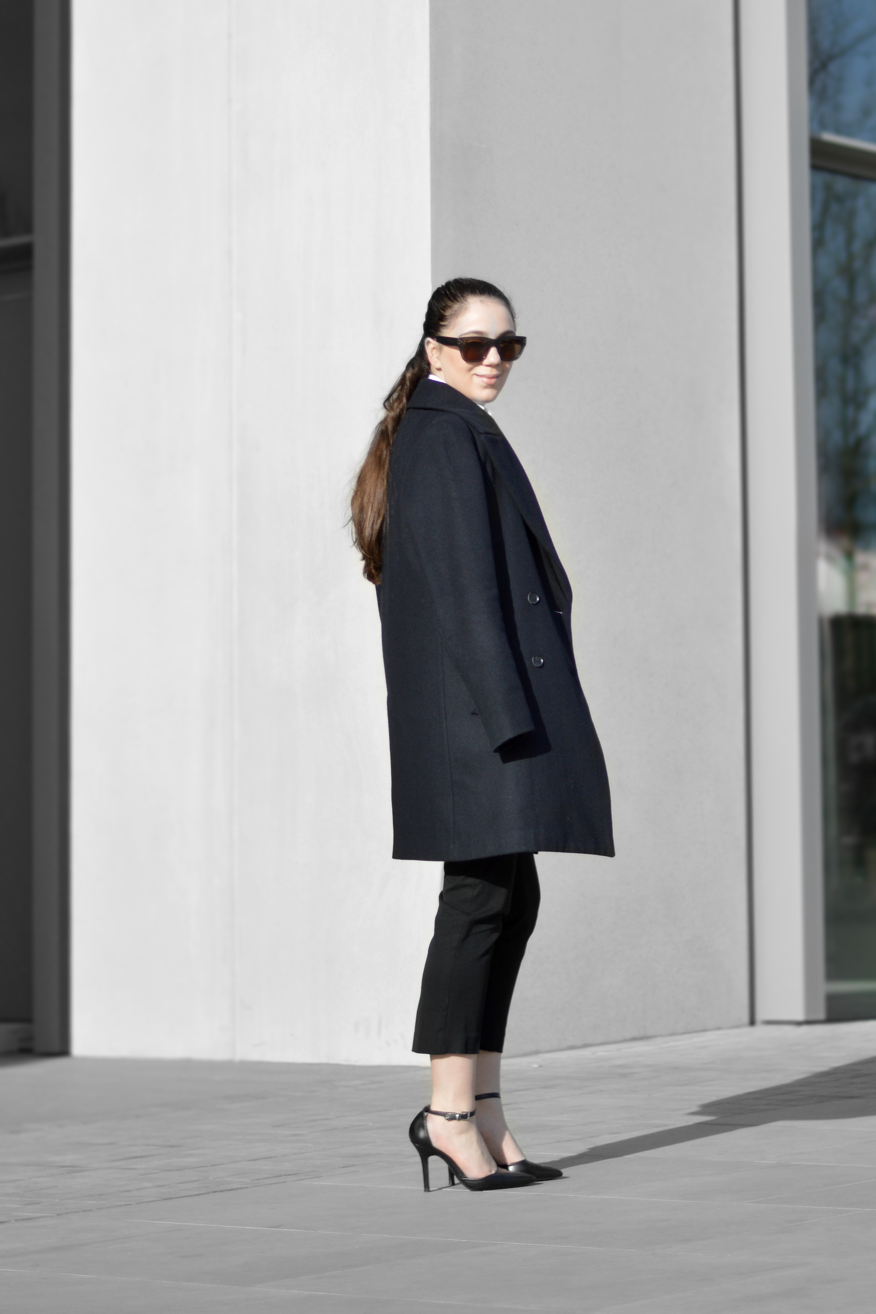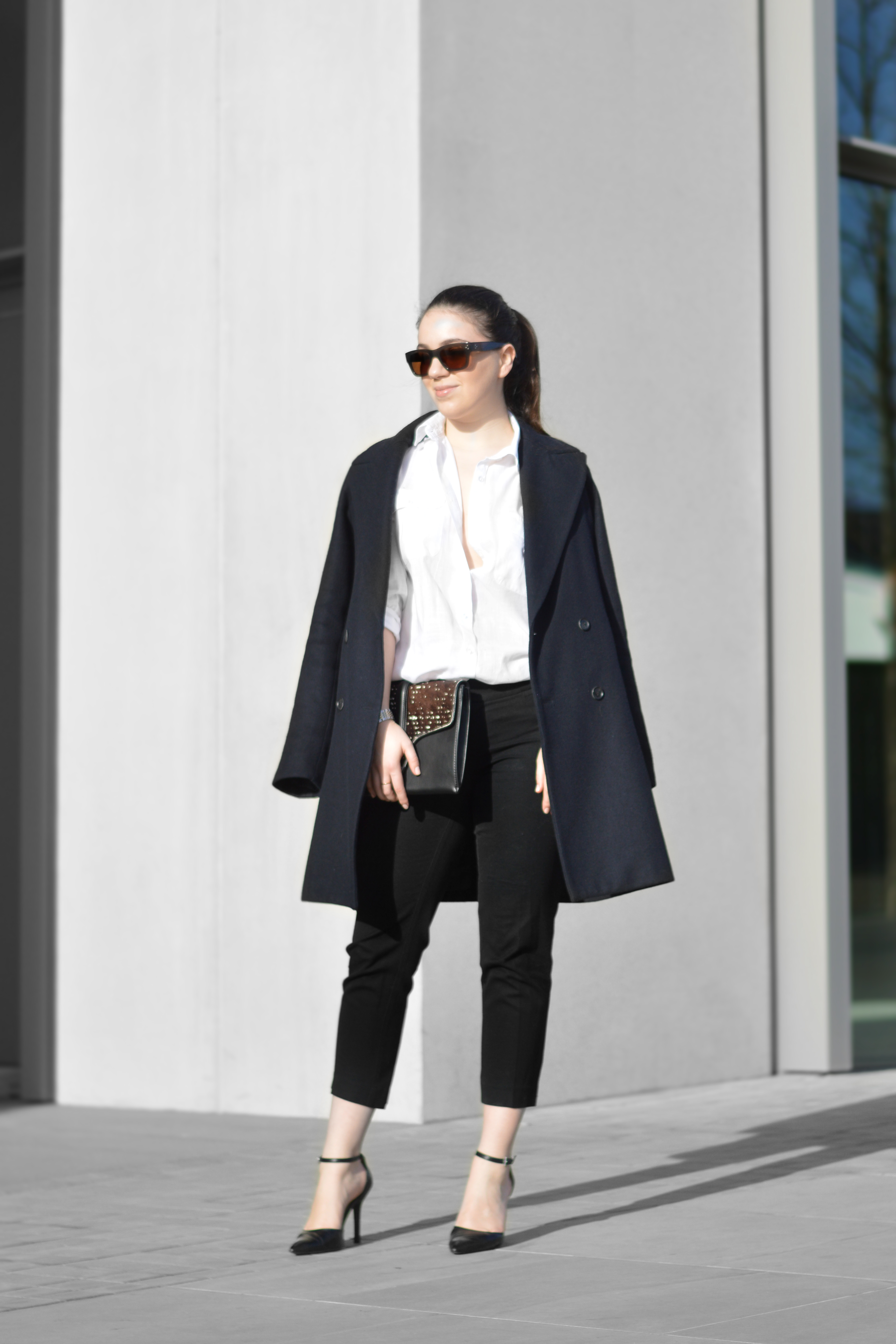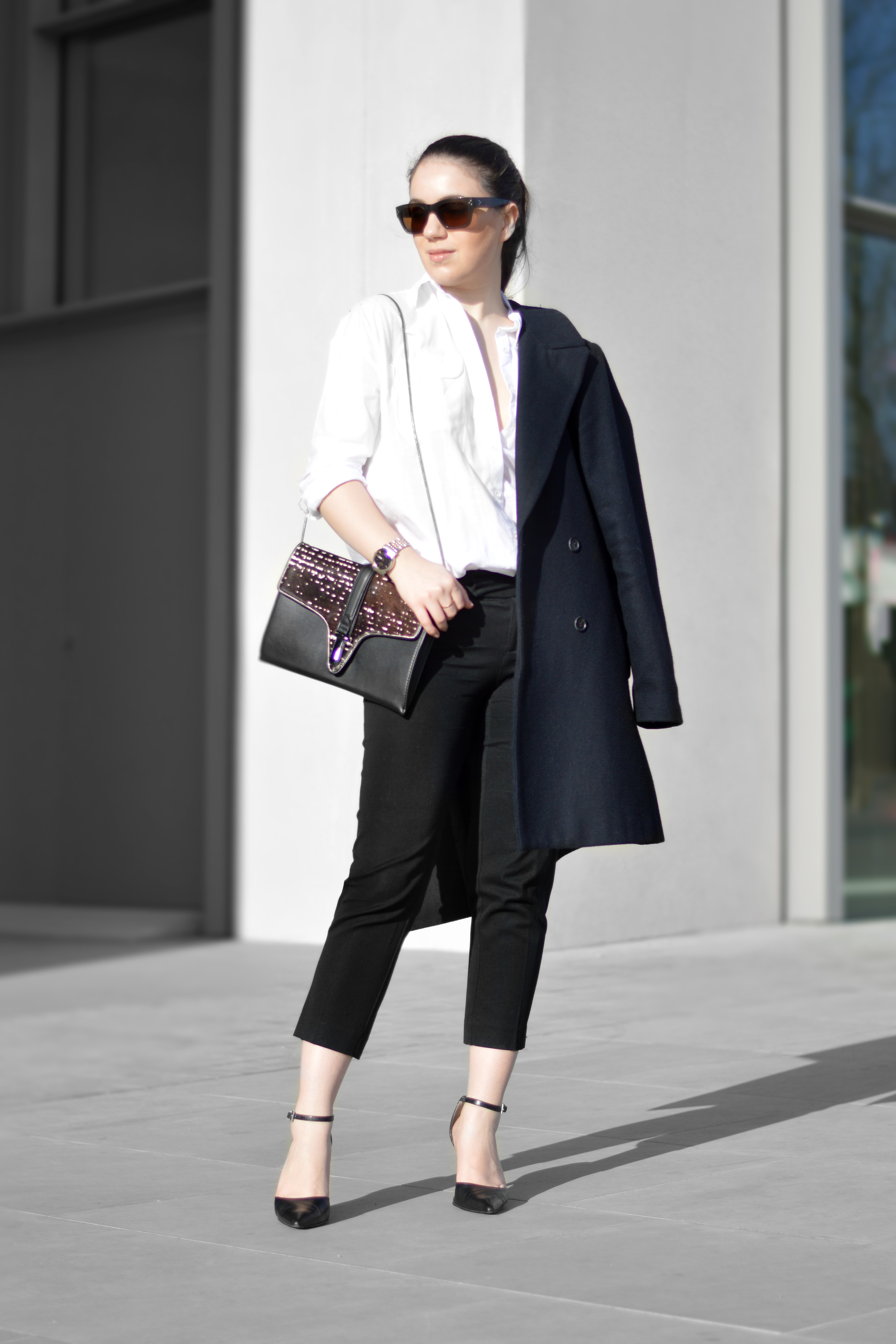 What’s your favourite way of dressing up the basic office wear pieces? Mine is adding a feminine touch to it, but still keeping it classic. I love mixing feminine and masculine pieces, like a basic white shirt while softening up the neutral cropped pant with a printed leather clutch; and of course those “to die for” heels! To give it a little less of a monochrome look, I added a navy blue coat, keeping me warm and also creating a great balance to a sophisticated simple office look thats ready for any meeting!