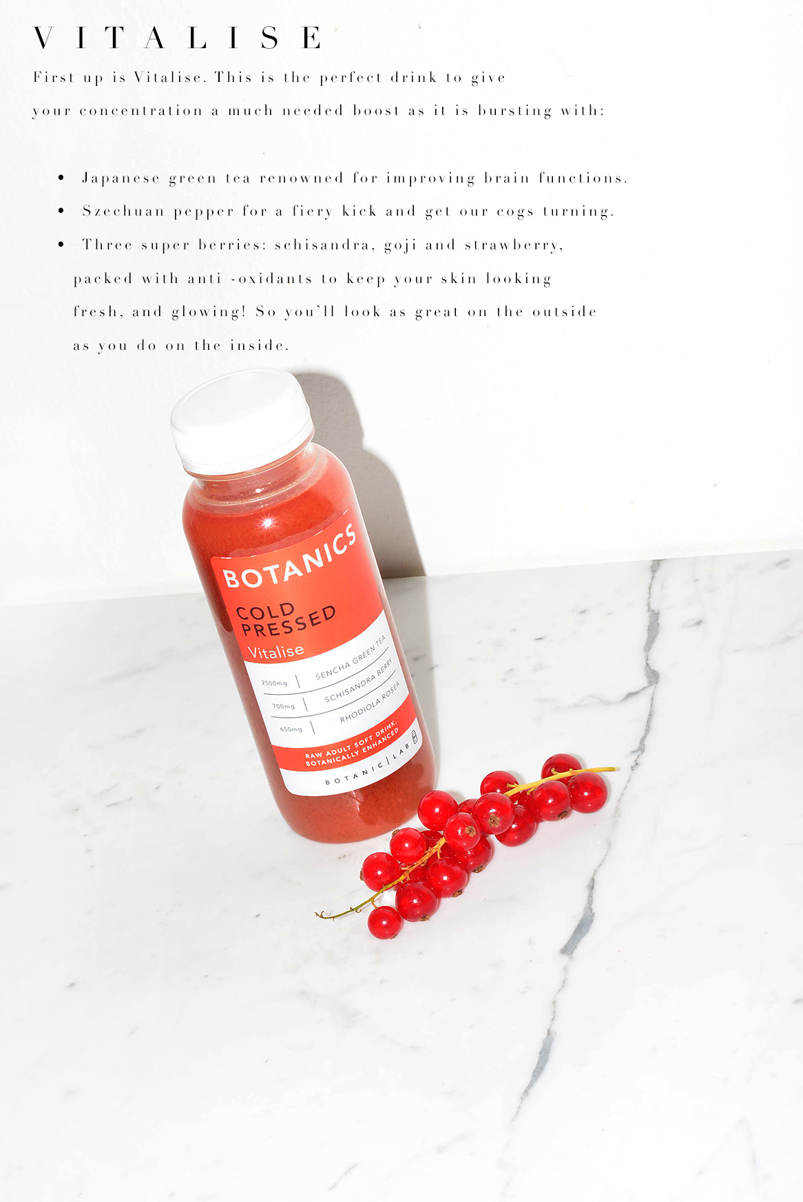 I’ve recently stumbled across All Bar One Botanic cold press drinks. They are so light and delicious, coming in three flavours Vitalise, Fortify and Invigorate. To detoxify I simply have one before breakfast (my favourite is Vitalise flavour, it’s a little sour so it wakes me up in the morning). It’s proven to give me the healthy kick I need each day, never failing to make me feel healthy and nutritious.