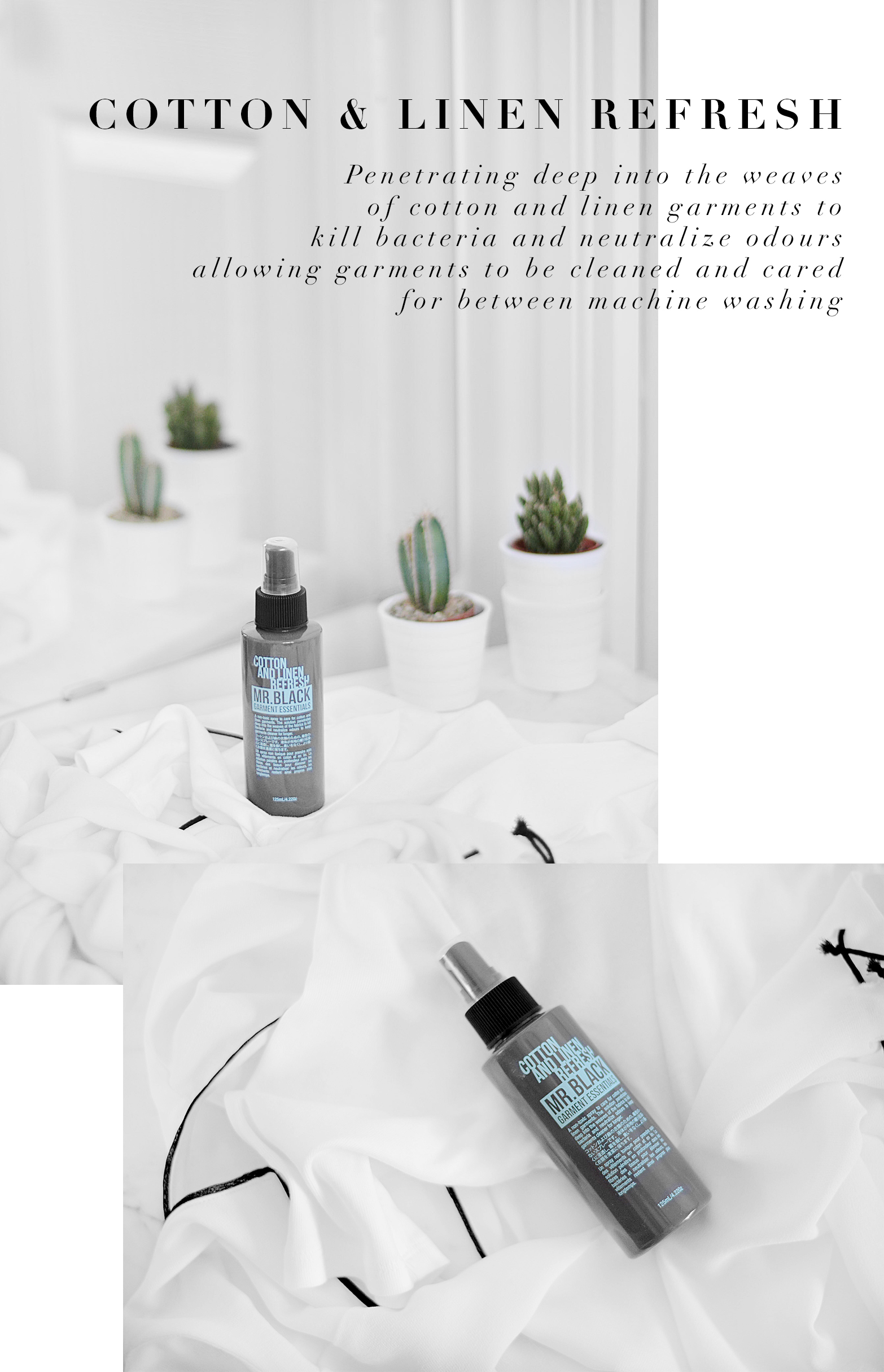 So, when it comes to taking care of my clothes, I like to keep it simple and practical while not doing any damage to the fabric in-between washes.  Without further ado, I introduce you to Mr.Black garment essentials – the little bottled gems that have made me change the way I look after my clothes on a daily basis. Each individual bottle extends the life of your cashmere, denim, linen and delicates. A unique natural formulation that keeps your favorites looking better for longer between washes – and saves me on dry cleaning. It’s very simple, hassle free and they do exactly what it says on the tin.